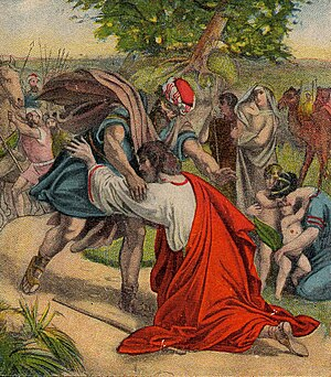 Forgive, and ye shall be forgiven, as in the reconciliation of Jacob and Esau in Genesis 33, after Julius Schnorr von Carolsfeld, illustration from a Bible card published by the Providence Lithograph Company (Photo credit: Wikipedia)